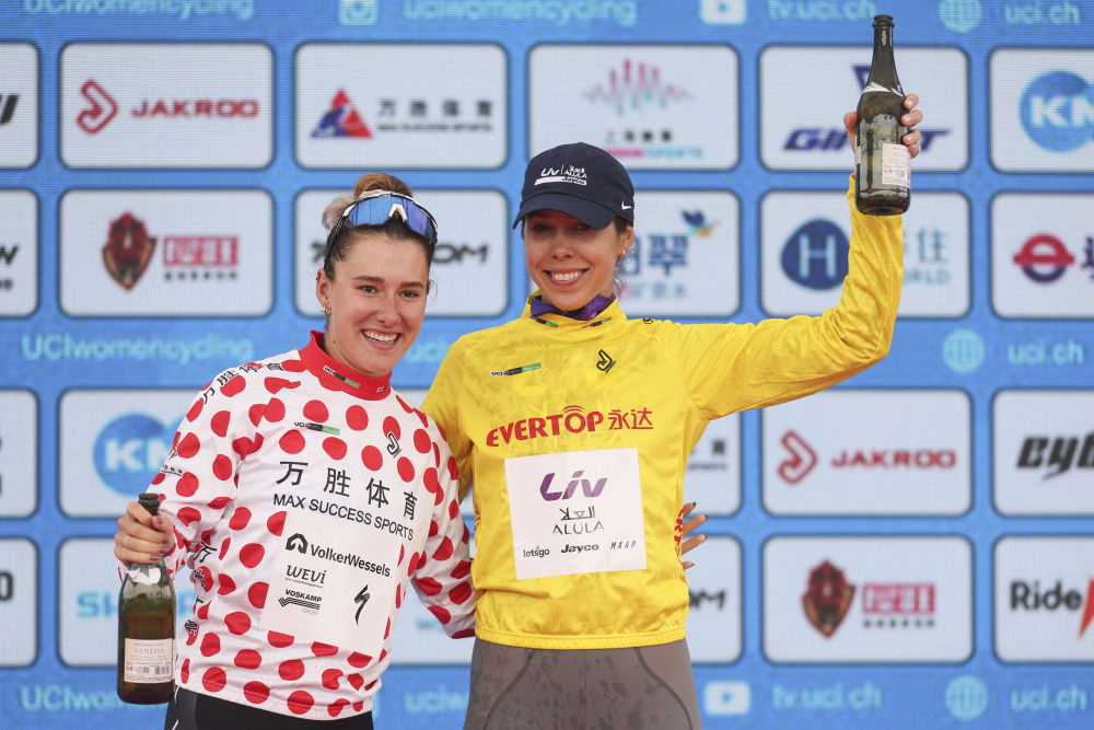 10月14日,身著代表爬坡總積分第一名的圓點(diǎn)衫的安妮·克妮珍寶(左)和身著代表個(gè)人總成績第一名的黃衫的貝克在頒獎(jiǎng)儀式上慶祝。新華社記者 王翔 攝