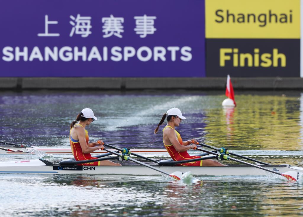 2025年9月26日,陳云霞(左)與張靈在比賽中。當(dāng)日,在上海舉行的2025年世界賽艇錦標(biāo)賽女子雙人雙槳A組決賽中,中國(guó)選手陳云霞/張靈斬獲銀牌。新華社記者 丁汀 攝