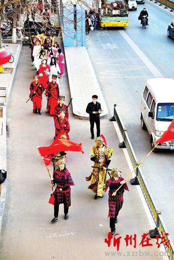 男的身披戰(zhàn)袍鎧甲,女的一襲古裝長裙,一支戰(zhàn)國時代的隊(duì)伍揮舞旗幟、佩帶長劍從忻州城區(qū)七一路走過?!笆遣皇桥碾娨晞×??”過往行人紛紛側(cè)目觀望。