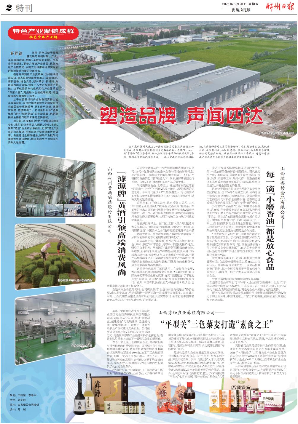 在廣袤的忻州大地上,一條充滿活力的食品產(chǎn)業(yè)鏈正加速形成,串聯(lián)起從田間耕耘到舌尖品味的每一個(gè)環(huán)節(jié)。從一滴“零添加”的小磨香油,到一盞沉淀千年風(fēng)雅的代州黃酒,再到一粒粒晶瑩飽滿的有機(jī)大米……本土食品企業(yè)以不同的路徑,共同詮釋著對(duì)品質(zhì)的執(zhí)著堅(jiān)守。它們或堅(jiān)守古法,或銳意創(chuàng)新,或深耕科技,共同構(gòu)建起一條從種植、加工到銷售深度融合的完整產(chǎn)業(yè)鏈。讓我們一同品味三晉風(fēng)味,感受特色食品產(chǎn)業(yè)在這片土地上書寫的高質(zhì)量發(fā)展新篇章。