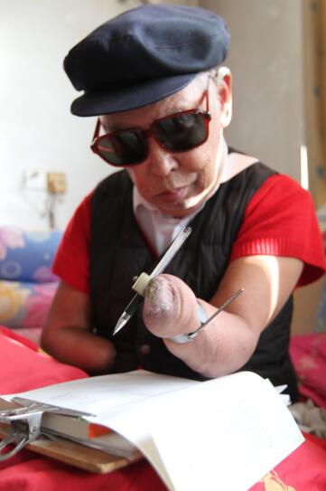 用嘴含筆寫,殘臂夾筆(抱臂)寫,鐵圈套筆寫。整整7年??喟究鄬懥?年,反復(fù)修改了7遍。2000多個(gè)日日夜夜,父親翻爛了四本字典,很多時(shí)候,胳膊翻書不方便,他就用嘴唇翻,用舌頭翻。用掉半噸稿紙,終于在1996年7月,出版了33萬(wàn)字的自傳體小說《極限人生》。