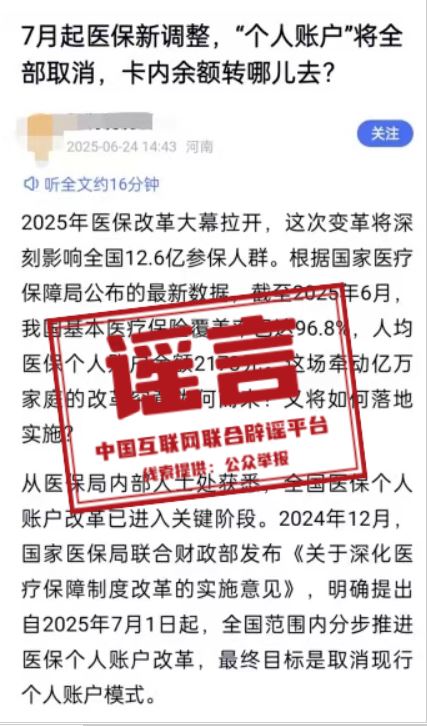 詳情:近日,一篇題為《7月起醫(yī)保新調(diào)整,“個(gè)人賬戶(hù)”將全部取消,卡內(nèi)余額轉(zhuǎn)哪里去?》的自媒體文章引起較多關(guān)注。文中宣稱(chēng)“從醫(yī)保局內(nèi)部人士處獲悉,全國(guó)醫(yī)保個(gè)人賬戶(hù)改革已進(jìn)入關(guān)鍵階段”“自2025年7月1日起,全國(guó)范圍內(nèi)分步推進(jìn)醫(yī)保個(gè)人賬戶(hù)改革,最終目標(biāo)是取消現(xiàn)行個(gè)人賬戶(hù)模式”。
