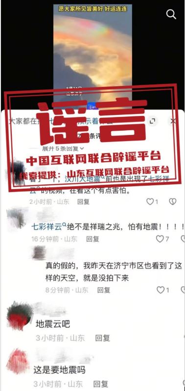 真相:近日,山東濟(jì)寧多地市民觀察到天空中出現(xiàn)大片色彩斑斕、形態(tài)似羽毛或波浪的云層,許多人稱之為“祥云”,有部分網(wǎng)民將它與“地震預(yù)測(cè)”的民間說(shuō)法相關(guān)聯(lián),稱是“地震云”“不是祥瑞之兆,是要地震”。