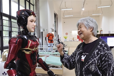 在深圳市養(yǎng)老護(hù)理院,一名老人與人形機(jī)器人“夏瀾”互動。新華社記者 梁旭 攝