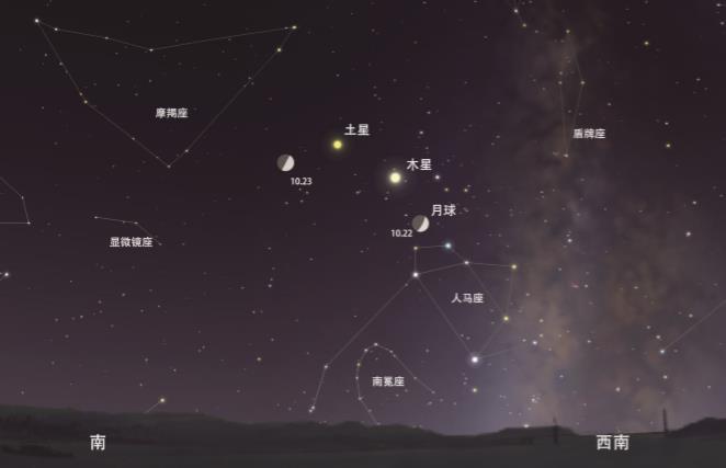 2020年10月22日~23日,日落后2個(gè)小時(shí)的西南方天空示意圖。(北京天文館供圖)