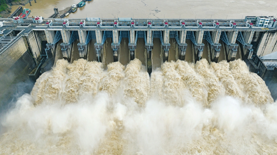 圖為6月16日,福建省閩江水口水電站12扇閘門(mén)全部開(kāi)啟泄洪。