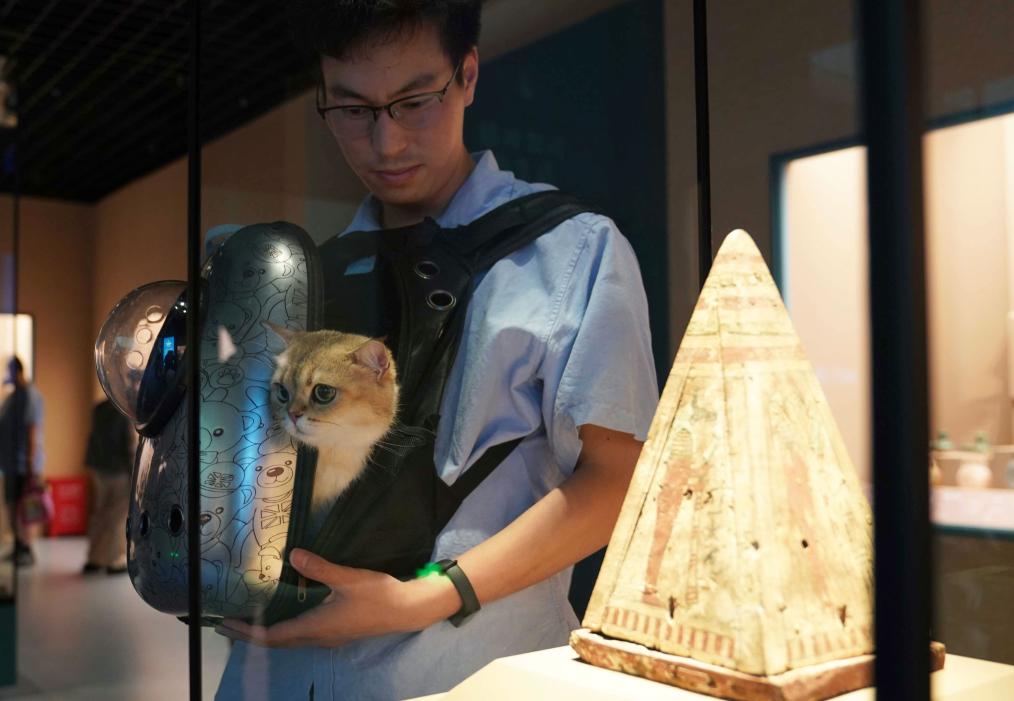 7月27日,寵物貓與主人在上海博物館“金字塔之巔:古埃及文明大展”“薩卡拉的秘密”展區(qū)內(nèi)觀展。新華社發(fā)(陳浩明攝)