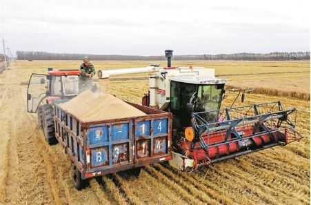 10月10日,農(nóng)業(yè)機械在黑龍江北大荒農(nóng)業(yè)股份有限公司友誼分公司第四管理區(qū)進行水稻收割作業(yè)。