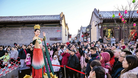 “在大同古城鬧紅火,真是年味兒十足、體驗(yàn)感拉滿?!眮?lái)自太原的游客張文文開(kāi)心地說(shuō)。春節(jié)假期,大同市文化活動(dòng)豐富多彩,以大同古城為中心,市縣(區(qū))聯(lián)動(dòng)開(kāi)展的“流光溢彩迎新年”“歡歌樂(lè)舞過(guò)大年”“梨園百花賀新年”“夢(mèng)幻冰雪逐夢(mèng)年”“翰墨書(shū)香文化年”“古都風(fēng)華盛世年”6個(gè)主題43項(xiàng)地方特色濃郁、群眾參與度高的文化活動(dòng),讓市民和游客目不暇接、流連忘返。在華嚴(yán)廣場(chǎng)、鼓樓東西街、下寺坡街、關(guān)帝廟戲臺(tái)、純陽(yáng)宮廣場(chǎng)、大廟角、古城東南邑等處,社火巡游、過(guò)大年唱大戲、文化IP演繹、市集等活動(dòng)精彩紛呈。
