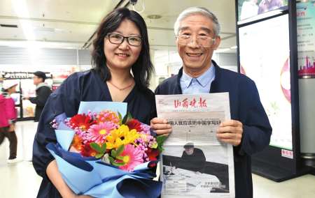 在接站口,“姥爺”接過記者遞上的鮮花,看到刊載報道他的4月2日的報紙,咧嘴一笑,一再說“謝謝,謝謝”,記者用鏡頭和文字記錄下這份喜悅。交城縣委宣傳部也派出了接機小分隊,打著“我們愛你,山西姥爺”等歡迎牌,把姥爺護送回家。
