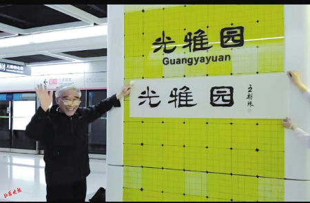 2、4.“山西姥爺”和自己題寫的深圳地鐵10號線站名同框。