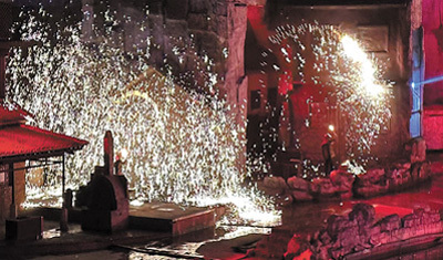 大年初七,晚上7點(diǎn),山西省晉城市司徒小鎮(zhèn)的山水實(shí)景劇《千年鐵魂》準(zhǔn)時開演。當(dāng)臺上的幾位工匠將金黃色的鐵水一齊拋灑向天空,絢爛的鐵花在空中綻放,氣勢磅礴。觀眾的情緒也在此刻到達(dá)頂峰。
