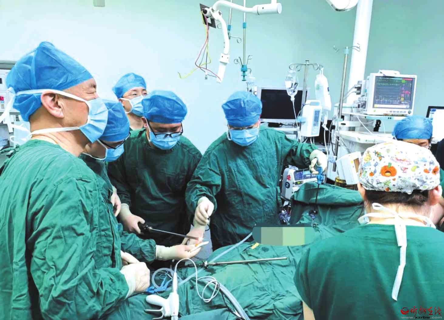 僅半小時,全部術(shù)前準(zhǔn)備就緒,普外科李瑞環(huán)主任、普外二病區(qū)婁月紅主任上臺,實施腔鏡探查。術(shù)中證實,患者脾臟被膜破裂,腹腔內(nèi)積血量達1500—2000毫升,出血迅猛、病情萬分危急。兩位主任臨危不亂、果斷處置,憑借豐富臨床經(jīng)驗與嫻熟操作技能,沉著應(yīng)戰(zhàn)、精準(zhǔn)施治,快速鉗扎止血、有效控制出血,歷時一個半小時順利完成脾切除術(shù)。從決策手術(shù)到手術(shù)結(jié)束,全程僅約2小時,以“快、準(zhǔn)、穩(wěn)”跑出生命救治“加速度”。目前,患者病情穩(wěn)定、恢復(fù)良好。