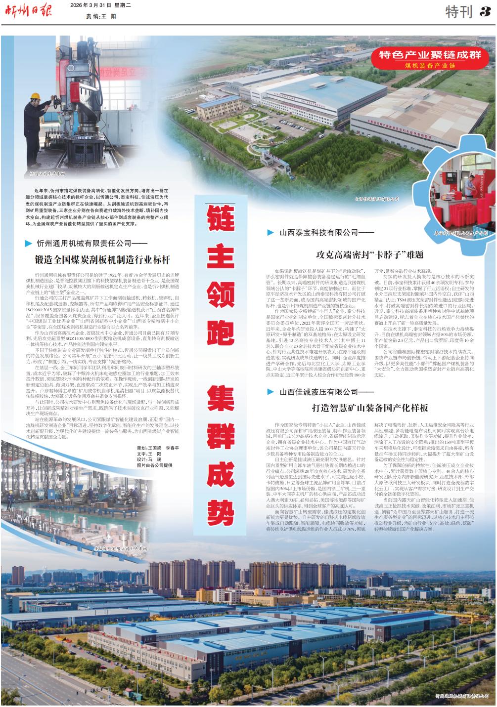 近年來,忻州市錨定煤炭裝備高端化、智能化發(fā)展方向,培育出一批在細(xì)分領(lǐng)域掌握核心技術(shù)的標(biāo)桿企業(yè),以忻通公司、泰寶科技、佳誠液壓為代表的煤機制造產(chǎn)業(yè)鏈集群正在快速崛起。從刮板輸送機到高端密封件,再到礦用重型裝備,三家企業(yè)分別在各自賽道打破海外技術(shù)壟斷、填補國內(nèi)技術(shù)空白,構(gòu)建起忻州煤機裝備產(chǎn)業(yè)鏈從核心部件到成套裝備的完整產(chǎn)業(yè)閉環(huán),為全國煤炭產(chǎn)業(yè)智能化轉(zhuǎn)型提供了堅實的國產(chǎn)化支撐。