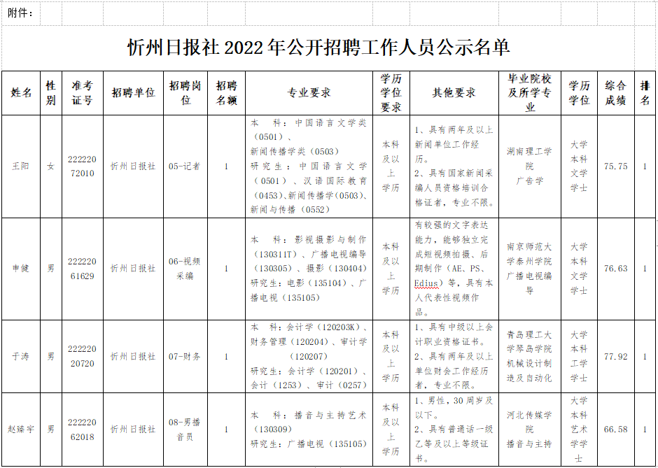 附件: 忻州日報(bào)社2022年公開招聘工作人員公示名單