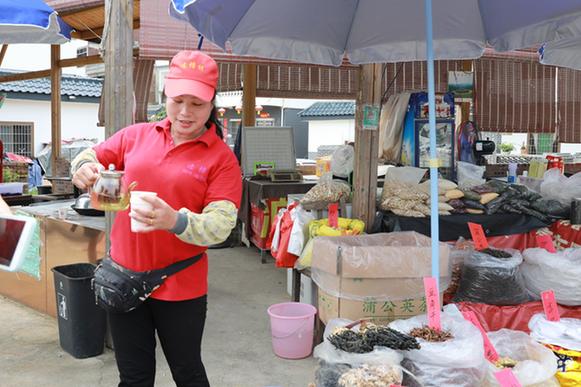 “天太熱,來喝口我這免費(fèi)的茶?!辈湃脒B樟村村口,記者便被熱情的村民陸秀媚招呼到了自己的攤位。紅茶、本地枝葉、山柑皮、筍干……她的攤位琳瑯滿目,擺得滿滿當(dāng)當(dāng)。陸秀媚告訴記者,自己曾經(jīng)在市里賣童裝,剛開始還能掙到些錢,后來隨著網(wǎng)購(gòu)興起,實(shí)體店的生意越來越難做。2018年,在習(xí)近平總書記來連樟村視察后,看到家鄉(xiāng)越變?cè)胶茫懶忝倪x擇了回到村里創(chuàng)業(yè)。