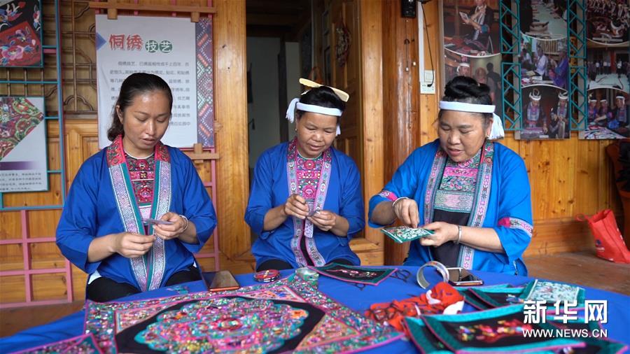 楊甜介紹,近年來,同樂鄉(xiāng)大力推動侗繡技藝傳承,采取“公司+基地+農(nóng)戶(貧困戶)”運行模式,組織技藝傳承人將侗繡技藝傳授給當(dāng)?shù)貗D女,帶動當(dāng)?shù)厝罕?00多戶參與刺繡,其中貧困戶50多戶,侗繡作品被銷往國內(nèi)外,實現(xiàn)了助農(nóng)增收。
