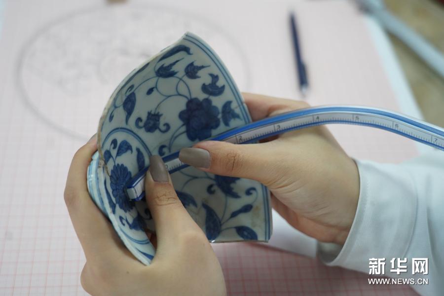 修復(fù)師何奕慧在測量一件瓷器,將三維瓷器上的圖案還原到二維的紙面上,必須要經(jīng)過仔細(xì)的測量(12月3日攝)。新華社記者 周密 攝