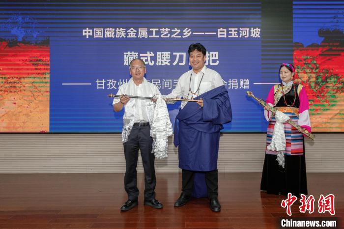 而甘孜州民族民間手工藝非遺協(xié)會會長、金屬鍛造傳承人日多向杭州工藝美術博物館捐贈了來自中國藏族金屬工藝之鄉(xiāng)——白玉河坡的兩把藏式腰刀。德格印經(jīng)院雕刻負責人、雕版印刷非遺傳承人江永扎巴則捐贈了兩件珍品:一件是大藏經(jīng)《甘珠爾》佛像全集版畫,共有58張,內(nèi)容包括208個佛像和9個塔的圖像,共計217個圖像;另一件是《千手千眼觀音》唐卡印版圖畫,這是收藏在德格印經(jīng)院里面最早的佛像印版之一,距今四百多年。