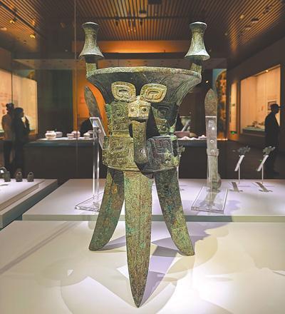 殷墟博物館與殷墟宗廟宮殿區(qū)隔河相望,是全景式展現(xiàn)商文明的國家重大考古專題博物館。圖為殷墟博物館里展出的殷墟婦好墓出土的銅斝。