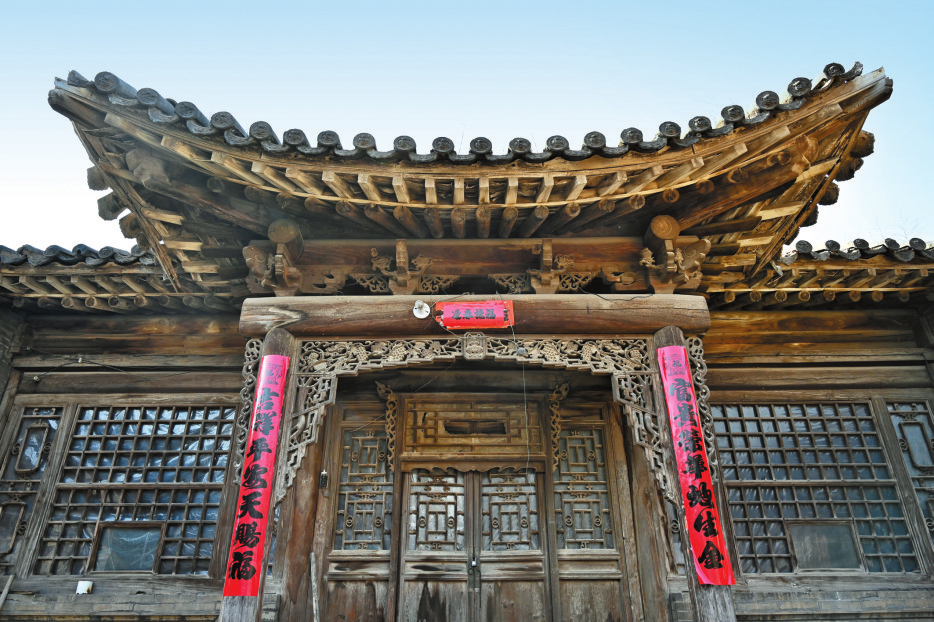 原平市上社村郝氏民居大門,建于清代。柱枋上設(shè)三朵斗拱,螞蚱型耍頭,雀替鏤刻動植物紋飾。