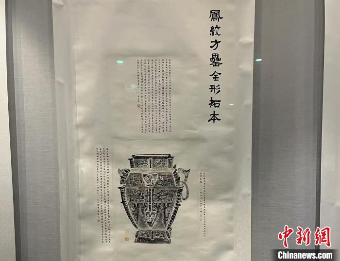 武漢博物館“墨拓千秋——金石器物全形傳拓技藝保護(hù)成果展”展出的鳳紋方罍全形拓本。 中新社記者 武一力 攝