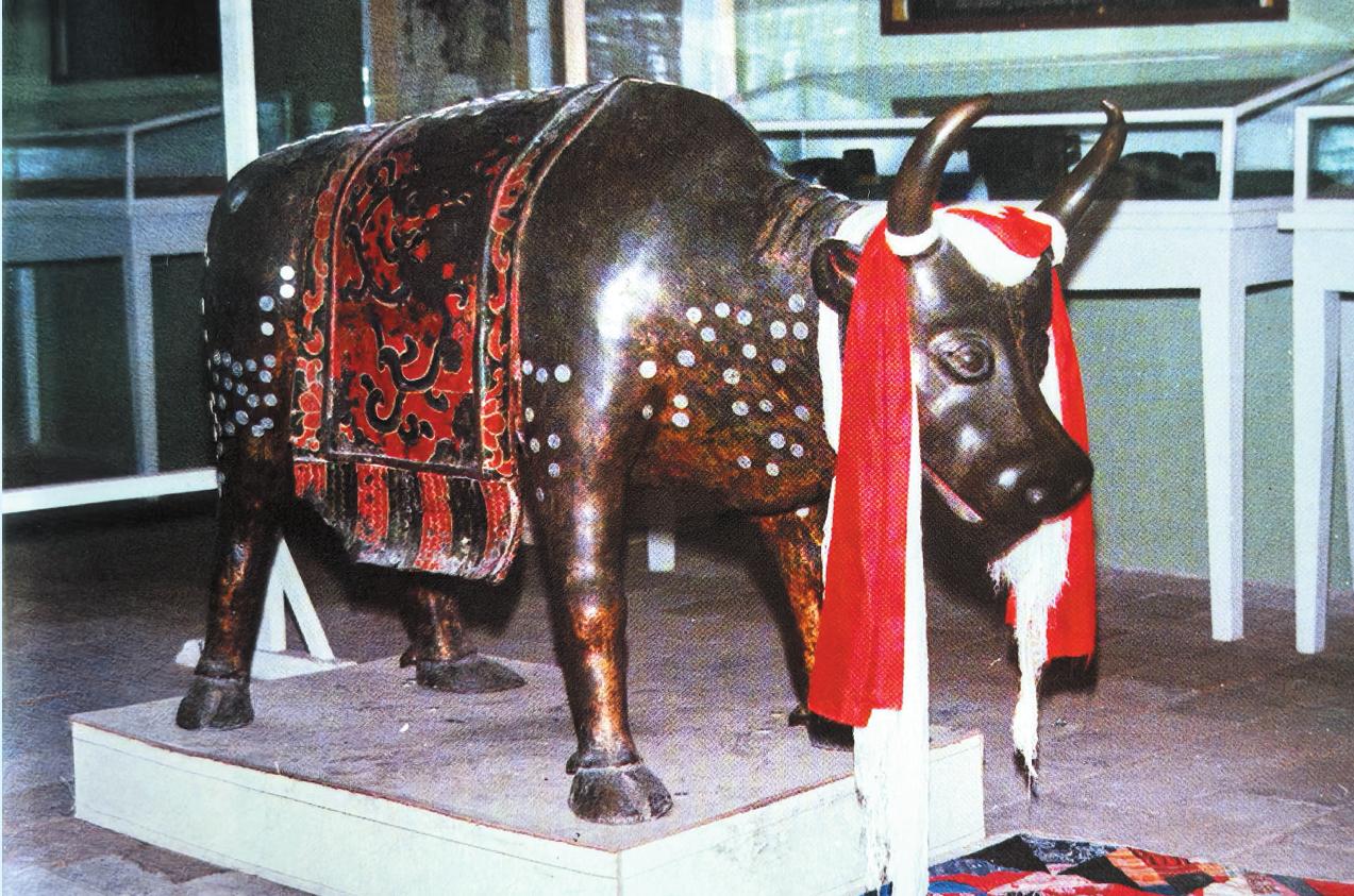 五臺山保存著一尊工藝精細、形態(tài)逼真、傳神入化的明代銅牛。這尊堪稱鑄造藝術品中佳品的銅牛,收藏在顯通寺藏珍樓內,通高85厘米,長146厘米。它體魄雄偉,頭向前伸,分足而立,兩角內收,閉嘴蓄力,圓目正視,奮力前行。銅牛四足協(xié)調,造型逼真。銅牛的腰部有披墊,披墊上面繪有各種彩色花紋。銅牛原來還拉著一輛精致的銅車。車棚、輪、軸及車上的繩索均為銅質。文物部門鑒定其為國家一級文物。