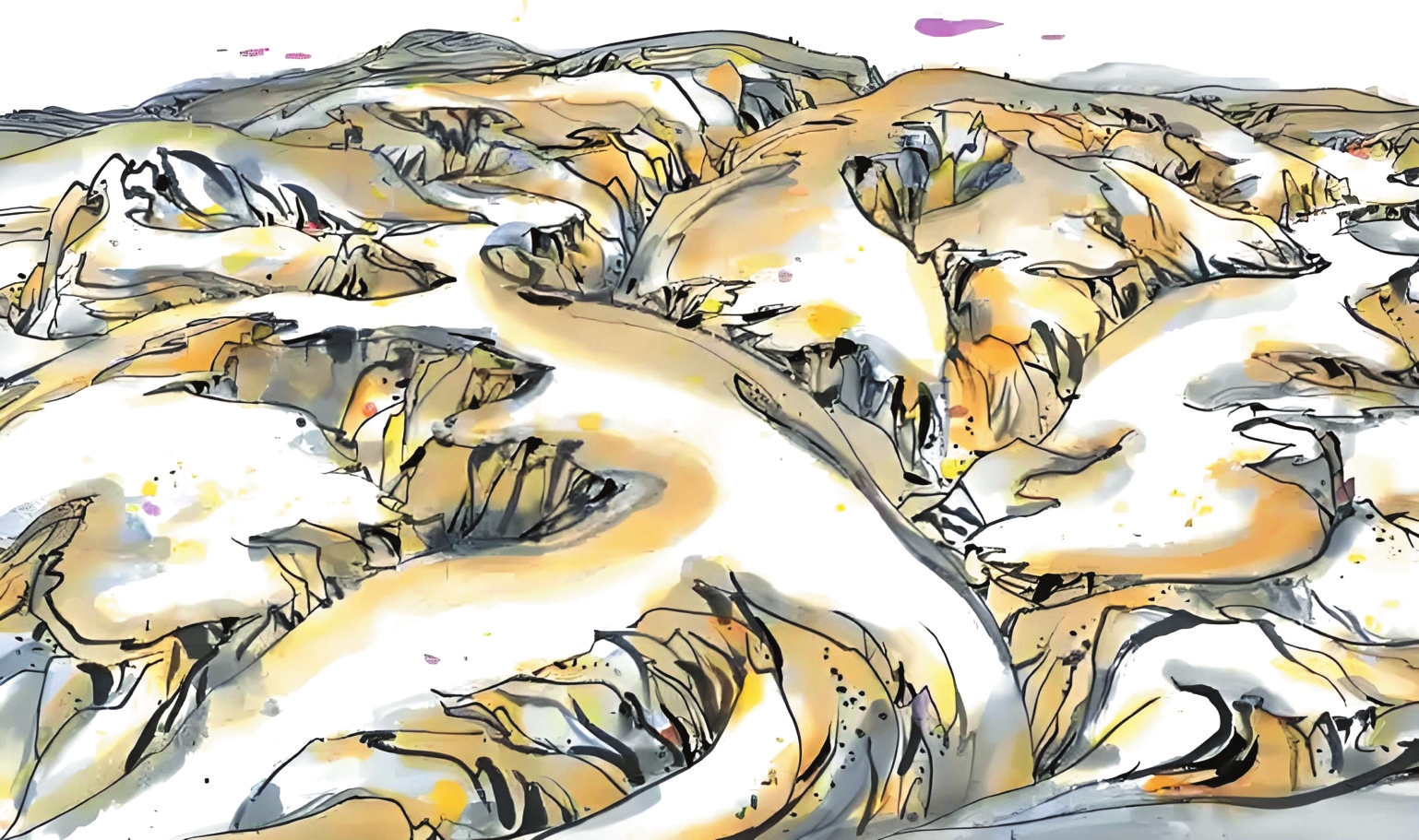1989年10月的河曲寫生,是吳冠中藝術(shù)生涯的重要轉(zhuǎn)折點。在陪同的學(xué)生王秦生引導(dǎo)下,這位古稀老人尋找“黃土荒漠之典型地區(qū)”,最終駐足晉西北河曲縣。每日晨起,他面對被雨水沖刷、滿山皆溝壑的地貌,靜心思考,猛然產(chǎn)生了驚人的藝術(shù)聯(lián)想——起伏的山形如同眾多老虎,而那些溝壑恰似老虎皮毛上的斑紋。他在《出現(xiàn)老虎》一文中寫道:“我終于發(fā)現(xiàn)黃土高原是展拓了的老虎之群,其間伏臥著無數(shù)猛虎,有的正將躍起,有的還在酣睡。作完數(shù)幅黃土高原,意猶未盡,于是我畫起老虎來?!边@種將地理特征轉(zhuǎn)化為藝術(shù)創(chuàng)作標(biāo)志著吳冠中完成“從風(fēng)景寫生到精神寫意”的蛻變,其價值在于為現(xiàn)代中國畫開辟了根植本土、融貫中西的新路徑。一個月河曲翠峰山寫生之旅誕生的《老虎高原》,更以極富樂感的線條勾勒出這片土地精神的圖騰。