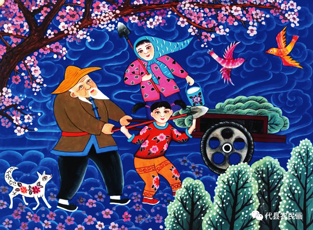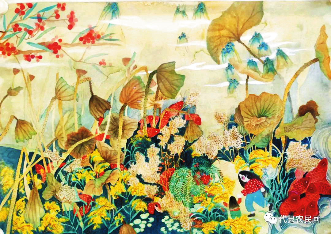 這些雁門巾幗,或是地道的農(nóng)民,或是行政事業(yè)單位、企業(yè)的工作者,或是退休下來的工薪人員,她們深深植根于代縣這方沃土,懷揣著對藝術(shù)的孜孜追求,不計名利,克服個人和家庭的重重困難,利用所有的空閑時間全身心投入到農(nóng)民畫的創(chuàng)作之中。