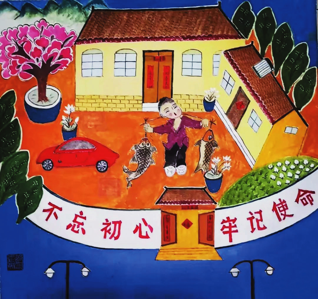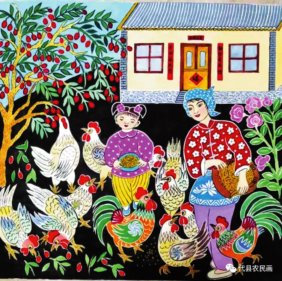 她們的作品,取材于農(nóng)村、農(nóng)業(yè)、農(nóng)民生活,或表現(xiàn)美好的生活場景,或反映豐收的喜悅,或體現(xiàn)鄉(xiāng)愁,在表現(xiàn)手法上采用大膽的夸張、變形,巧用艷麗的色彩,人物刻畫細致入微,內(nèi)心喜悅躍然紙上,富有鮮明的地方特色。綜觀她們的作品,無不展現(xiàn)了社會主義新農(nóng)村在新時代的新變化、新風貌,在傳承和弘揚代縣文化、引領(lǐng)社會主義精神文明建設(shè)方面做出了出色的嘗試與實踐。