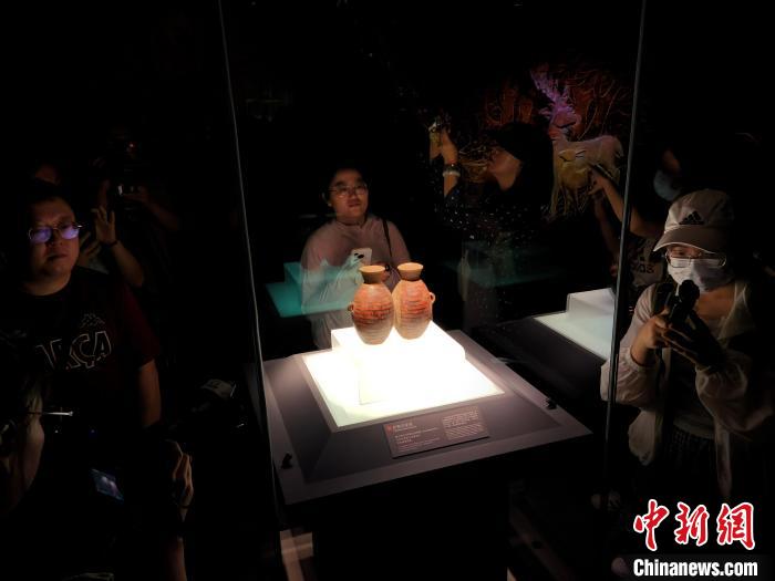 6月10日,河南鄭州大河村遺址博物館新館展出的彩陶雙連壺。 中新社記者 闞力 攝