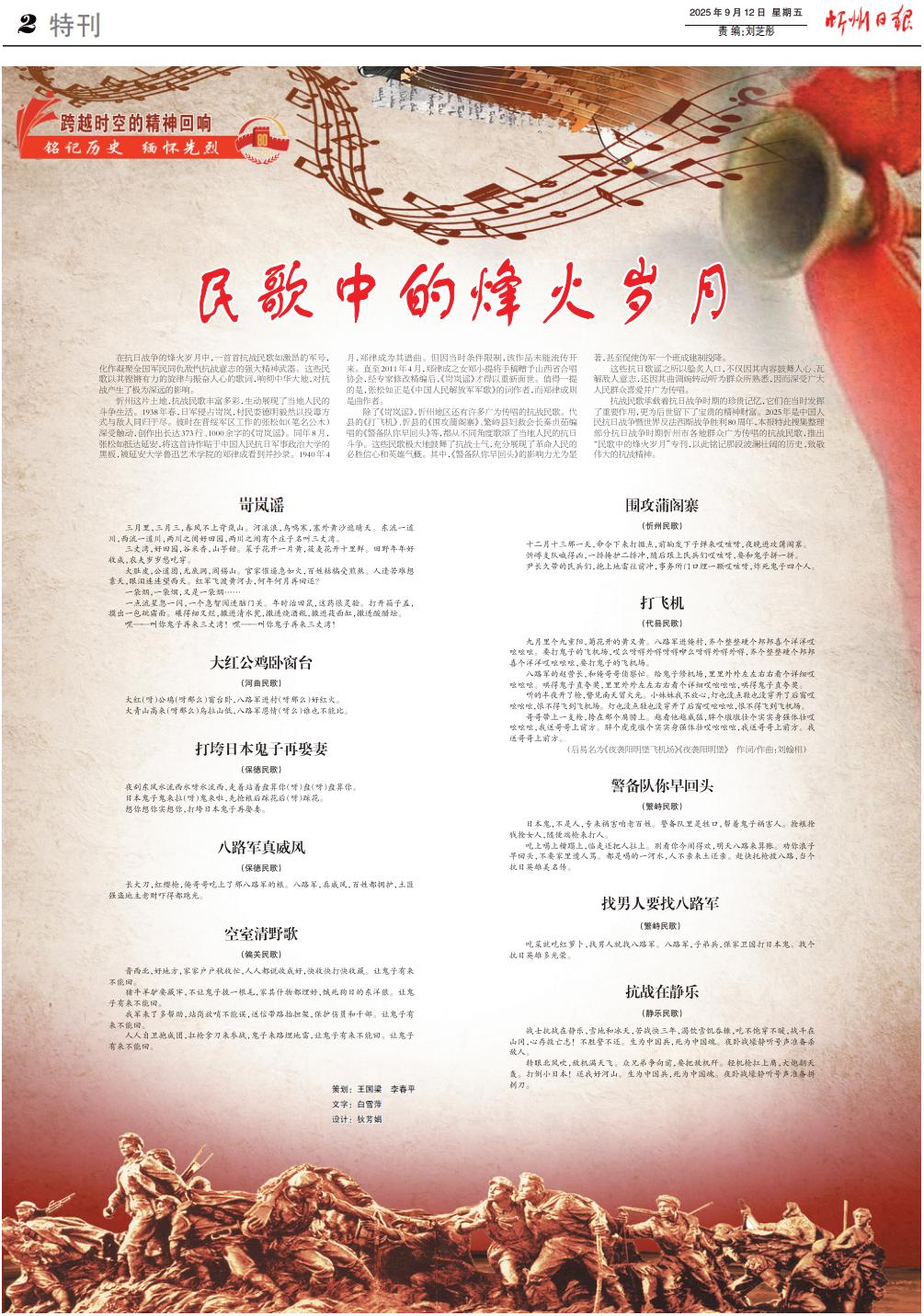 抗戰(zhàn)民歌承載著抗日戰(zhàn)爭時期的珍貴記憶,它們在當時發(fā)揮了重要作用,更為后世留下了寶貴的精神財富。2025年是中國人民抗日戰(zhàn)爭暨世界反法西斯戰(zhàn)爭勝利80周年,本報特此搜集整理部分抗日戰(zhàn)爭時期忻州市各地群眾廣為傳唱的抗戰(zhàn)民歌,推出“民歌中的烽火歲月”??源算懹浤嵌尾憠验煹臍v史,致敬偉大的抗戰(zhàn)精神。