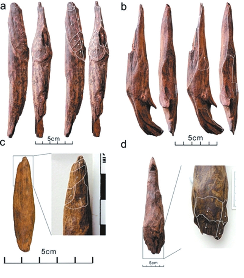 為論證這些木器的人工屬性,研究團隊開展了痕跡分析、殘留物分析和實驗模擬。結果表明,其中19件木器保留明顯的削刮痕,17件尖端表面存在使用所產生的磨光和破損跡象。這些痕跡出現(xiàn)在特定部位并具有方向性,是確鑿的人類加工與使用的證據(jù)。一些木器尖端保留土壤殘留物,從其上提取到植物淀粉粒,進一步證明這些木器主要功能是挖掘可食性的地下植物根莖。針對這些木器的模擬實驗表明,此類木器可以用簡單石器加工出來,并可有效用來挖掘植物的根莖。