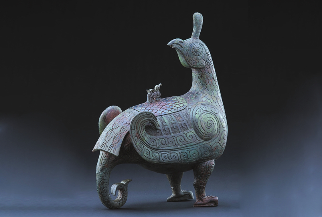 山西,東倚巍峨太行,西臨滔滔黃河,表里山河。作為中華民族的重要發(fā)祥地之一,這里地上地下的古代遺珍燦若星辰。晉侯鳥尊,高39厘米,長30.5厘米,寬17.5厘米。整個器物以佇立回首的鳳鳥為主體造型,鳥頭微昂,圓睛凝視,高冠直立,體軀豐滿,兩翼上卷。鳥背依形設(shè)蓋,蓋鈕為小鳥形,與鳳鳥對望,雙腿粗壯,爪尖略蜷。全身布滿了精美紋飾,頸、腹、背裝飾羽片紋,兩翼與雙腿裝飾云紋,翼、蓋間裝飾立羽紋,以雷紋襯底,尾部裝飾華麗的羽翎紋。