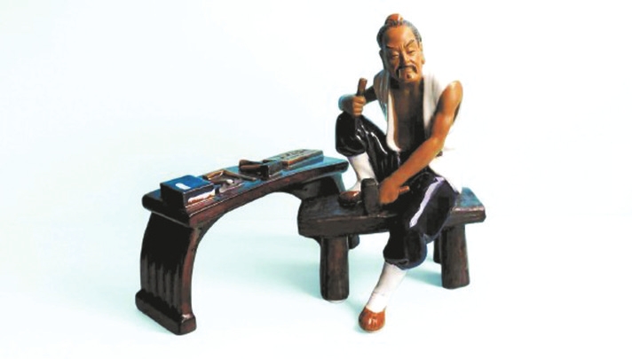 塑像高22厘米、長14厘米、寬13厘米,魯班右手持鑿、左手緊握鐵錘,雙目炯炯,仿佛正凝神思索,即將開啟一場巧奪天工的創(chuàng)作;身旁的工作臺長19.7厘米、寬6.5厘米、高10厘米,上面整齊擺放著曲尺、錘子、鑿子等工具。作品靈感源自春秋時期這位傳奇工匠的故事,以陶塑藝術(shù)為載體,栩栩如生地呈現(xiàn)出魯班的形象,讓歷史底蘊(yùn)與藝術(shù)魅力交融出獨特的韻味。
