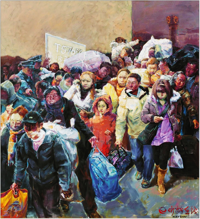 《春潮——回家過年》這幅作品是典型、真實(shí)的社會現(xiàn)實(shí)和人性本真的寫照,這個(gè)瞬間定格了一段讓多少人刻骨銘心的記憶,敘述了周期性的人類大遷徙——春運(yùn)。該畫所蘊(yùn)涵的是中國人心中那份最飽滿的希望。旅客是彼此都不認(rèn)識的陌生人,為了一個(gè)回家的目的,毫無距離地?cái)D在一起,人物個(gè)性鮮明。畫家具有強(qiáng)大的創(chuàng)作能力和藝術(shù)表現(xiàn)力。(邢晨聲 文)
