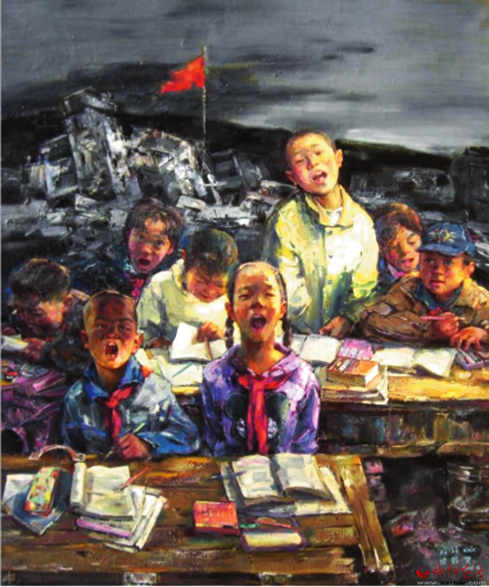 同樣表現(xiàn)地震題材的另一幅作品《震后復(fù)課》則展示出另外一種浪漫情懷,發(fā)人深省,令人感慨萬千。在尚未處理完畢的地震廢墟上,孩子們真誠(chéng)地開始了希望的追求,展示著大震壓不垮的人性力量和災(zāi)后最具震撼力的希望。是的,紅旗在哪里,精神支撐就在哪里。孩子是希望,是未來。在孩子們的臉上,沒有恐懼和悲哀,沒有茫然與無助,有的只是對(duì)知識(shí)的渴望,對(duì)未來的憧憬。一個(gè)角落的復(fù)課場(chǎng)景,映射著中華民族偉大復(fù)興的精神力量。 邢晨聲 文