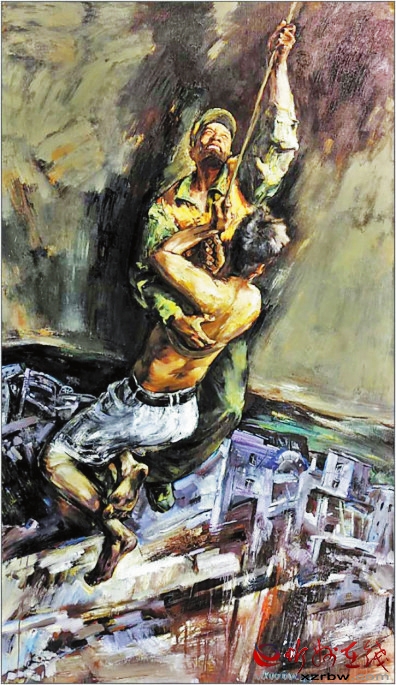 作品《空中救援》中,觀者首先感受到的就是難度。主題表現(xiàn)的事件難度和畫面表現(xiàn)處理的難度交織在一起,讓我們?cè)隗@險(xiǎn)、焦急的心理壓力下感受到生命的脆弱??罩芯仍闪松奈ㄒ煌ǖ?。救援同樣是險(xiǎn)象環(huán)生、驚心動(dòng)魄。從畫面處理技巧上是一種挑戰(zhàn),天空與地面的透視關(guān)系,動(dòng)感與靜態(tài)的對(duì)立統(tǒng)一,那種命懸一線的緊迫感對(duì)心理的沖擊力,通過大刀闊斧的刮刀、筆觸處理,和蒼涼緊迫的色調(diào)關(guān)系,準(zhǔn)確地展示了主題思想,大膽省略了一些不必要的細(xì)節(jié)描寫。用大筆觸、大色塊表現(xiàn)背景的壓抑和險(xiǎn)峻,救援主體成為沖破這一重壓的希望之色。沒有去刻意刻畫天與地的真實(shí)場(chǎng)景,簡(jiǎn)潔概括但不呆板空洞,這種果斷的駕馭,是續(xù)鶴賢真實(shí)實(shí)力的體現(xiàn)。 邢晨聲 文