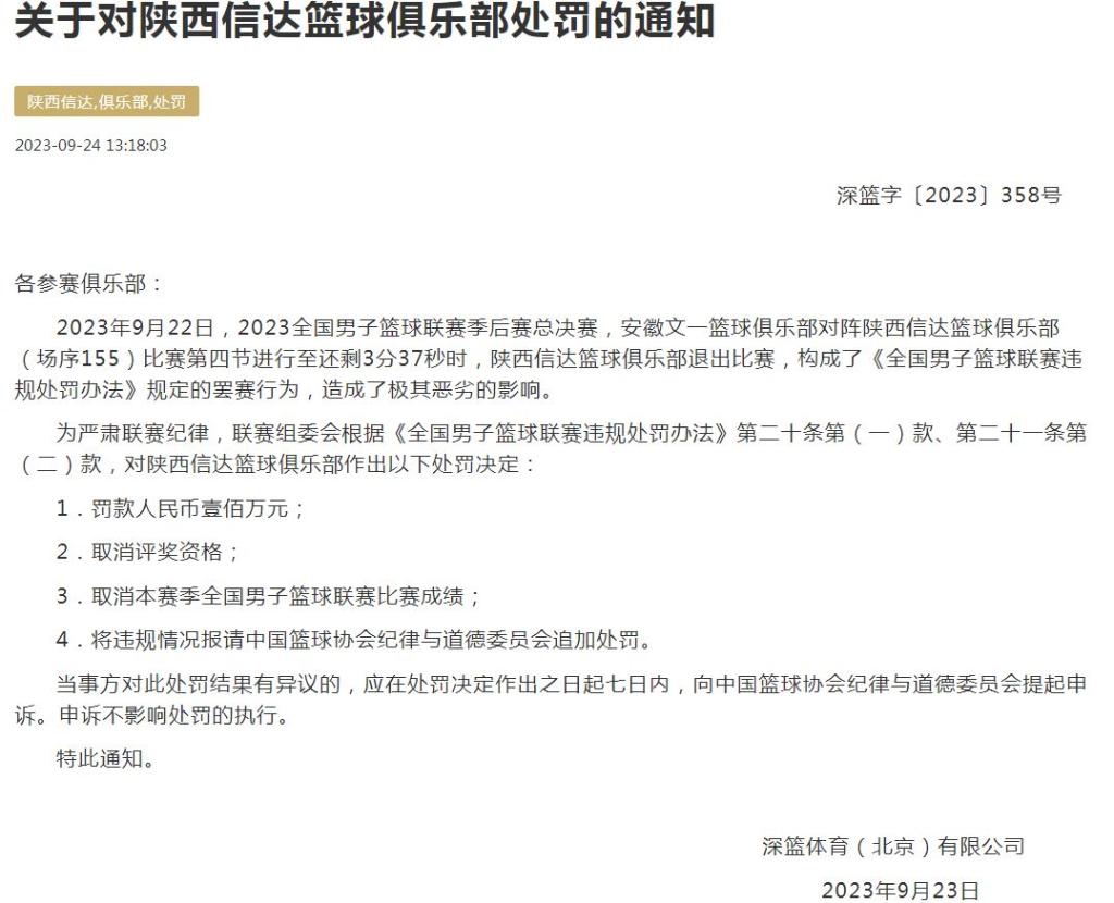 新華社北京9月24日電 針對陜西信達(dá)籃球俱樂部在全國男子籃球聯(lián)賽(NBL)總決賽第一場比賽中途棄賽事件,NBL聯(lián)賽組委會24日通過官方微博發(fā)布情況說明,將該行為認(rèn)定為罷賽,總決賽后續(xù)場次不再進(jìn)行。中國籃球協(xié)會官方網(wǎng)站隨后發(fā)布了處罰通知,聯(lián)賽組委會對陜西信達(dá)籃球俱樂部罰款100萬元,取消本賽季NBL比賽成績。 22日晚,2023NBL總決賽第一場比賽由安徽文一主場對陣陜西信達(dá)。比賽進(jìn)行至第四節(jié)還剩3分37秒時(shí),陜西信達(dá)請求暫停并全隊(duì)離場,當(dāng)時(shí)場上比分為102:96,安徽文一領(lǐng)先。在暫停時(shí)間結(jié)束后,陜西信達(dá)仍未返回賽場,比賽就此結(jié)束。