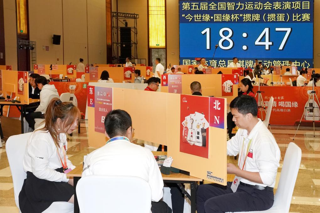 這是摜蛋項目首次進入智運會,比賽設男子雙人賽、女子雙人賽、混合雙人賽3個競賽項目,執(zhí)行國家體育總局棋牌運動管理中心審定的《競技摜蛋競賽規(guī)則(試行)》,分預賽、決賽兩個階段進行。預賽采用場分制瑞士積分編排賽,進行7輪比賽,決賽采用豪威爾制,進行9輪比賽。比賽均采用計算機預制比賽用牌,全場同牌,以得分決定名次。
