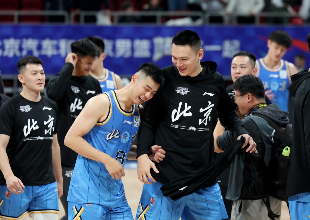11月8日,北京隊球員朱彥西(前右)賽后與隊友方碩(前左)慶祝勝利。新華社記者 張晨 攝
