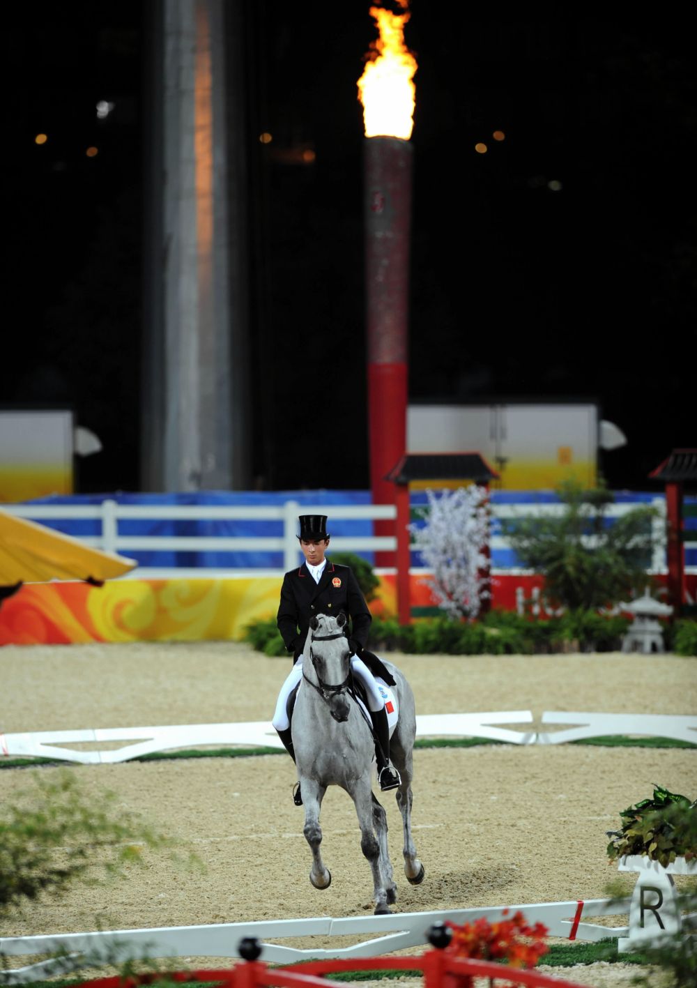 2008年8月9日,中國騎手華天在比賽中。當(dāng)日,中國騎手華天在香港參加北京奧運(yùn)會馬術(shù)比賽三項(xiàng)賽盛裝舞步賽,這是中國運(yùn)動員首次亮相奧運(yùn)馬術(shù)比賽場。新華社記者 盧炳輝 攝
