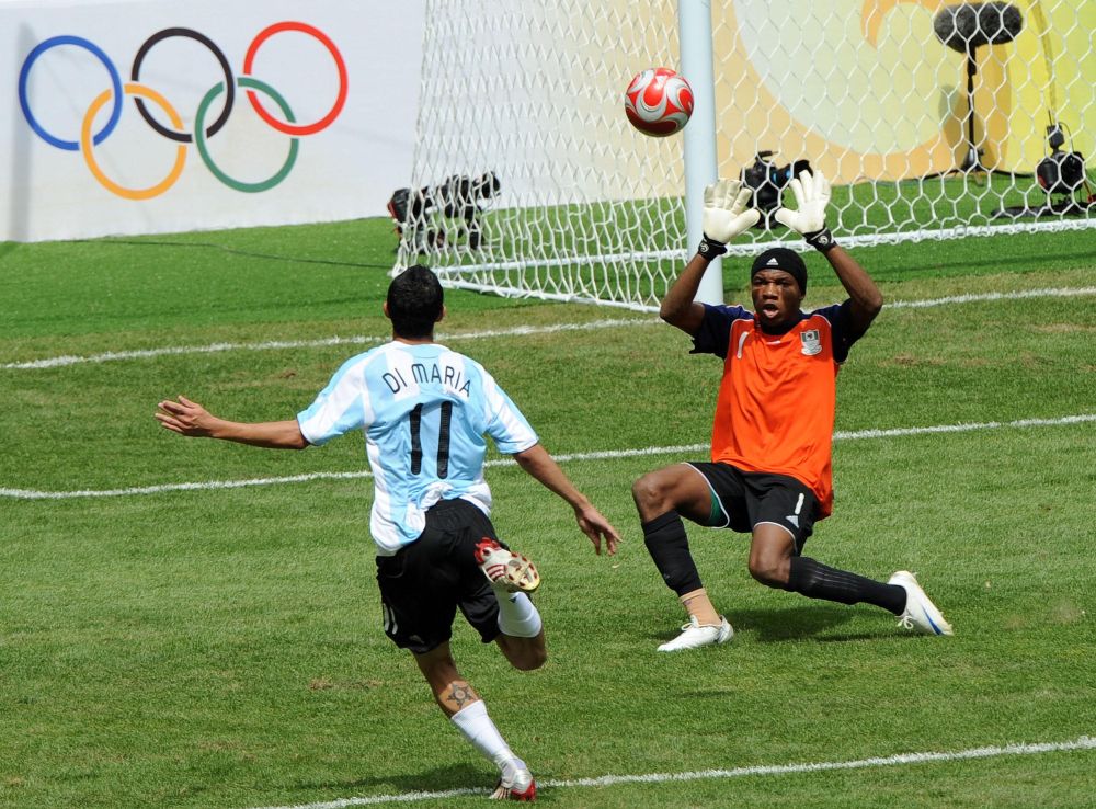 2008年8月23日,阿根廷隊球員迪馬利亞(左)破門得分。當(dāng)日,北京奧運會男子足球決賽在國家體育場——“鳥巢”舉行,阿根廷隊迎戰(zhàn)尼日利亞隊。新華社記者 李鋼 攝