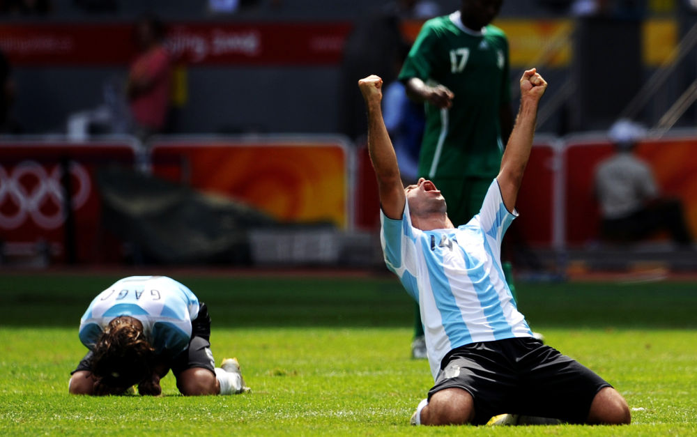 2008年8月23日,阿根廷隊球員馬斯切拉諾(右)慶祝勝利。當(dāng)日,北京奧運會男子足球決賽在國家體育場——“鳥巢”舉行,阿根廷隊1:0戰(zhàn)勝尼日利亞隊獲得冠軍。新華社記者 楊磊 攝
