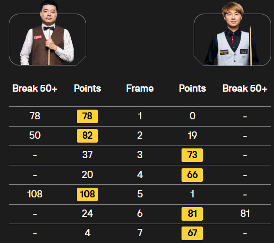 丁俊暉與徐思比賽的比分?jǐn)?shù)據(jù)。圖片來自斯諾克世界大獎(jiǎng)賽官網(wǎng)