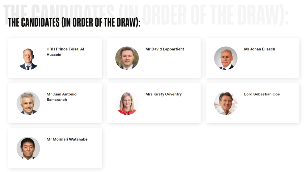 在國際奧委會近131年的歷史上,一共產生過九位主席,其中八人來自歐洲,另外一位來自美國。根據(jù)《奧林匹克憲章》,主席候選人必須是現(xiàn)任國際奧委會委員。本次參與競選的共有七人,其中歐洲四人,分別是國際奧委會副主席小薩馬蘭奇(65歲,西班牙)、世界田聯(lián)主席塞巴斯蒂安·科(68歲,英國)、國際自行車聯(lián)盟主席大衛(wèi)·拉帕爾蒂安(51歲,法國)和國際雪聯(lián)主席約翰·埃利亞施(63歲,瑞典和英國雙重國籍);亞洲兩人,分別是國際奧委會執(zhí)委費薩爾·侯賽因(61歲,約旦)和國際體操聯(lián)合會主席渡邊守成(66歲,日本);非洲一人,國際奧委會執(zhí)委、運動員委員會前主席柯絲蒂·考文垂(41歲,津巴布韋)。
