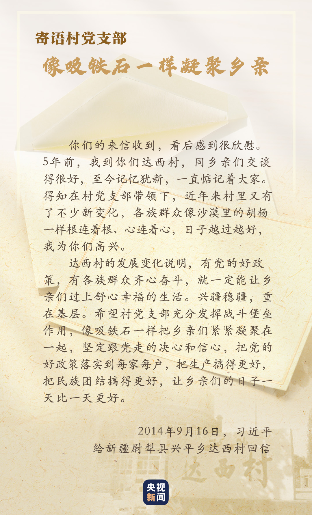 “口袋里要鼓囊囊,精神上要亮堂堂”。2014年4月,習近平在新疆考察時講到了達西村的村訓。村民們懷著激動的心情給總書記寫信,匯報這些年村里的積極變化。當年9月,習近平總書記給沙吾爾·芒力克和全體村民回信,強調(diào)興疆穩(wěn)疆,重在基層。