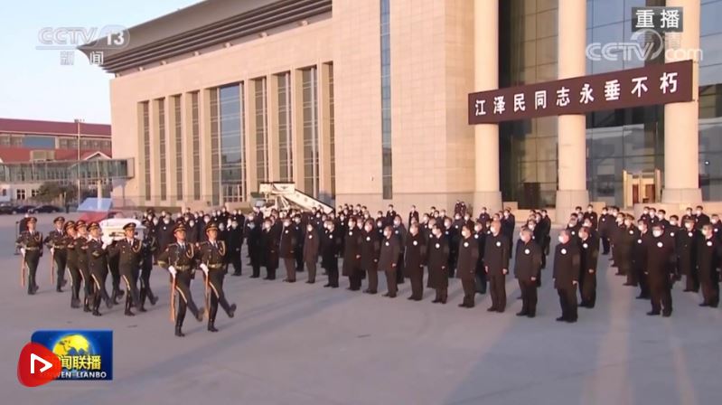 北京西郊機(jī)場國旗半垂,氣氛莊嚴(yán)肅穆,黑底白字橫幅上寫著:“江澤民同志永垂不朽”“江澤民同志永遠(yuǎn)活在我們心中”。習(xí)近平和夫人彭麗媛等胸佩白花、臂戴黑紗,神情凝重地在停機(jī)坪肅立。