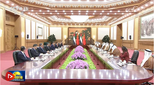 習近平指出,阿聯(lián)酋是中國的全面戰(zhàn)略伙伴,中方始終高度重視發(fā)展同阿聯(lián)酋的關(guān)系。在雙方共同努力下,中阿關(guān)系保持健康穩(wěn)定發(fā)展,政治互信不斷加深,務實合作穩(wěn)步推進,人文交流豐富多彩。鞏固和提升中阿關(guān)系是雙方的堅定共識,符合兩國人民期待。中方愿同阿方攜手同行,打造更加穩(wěn)固堅韌、富有活力的中阿全面戰(zhàn)略伙伴關(guān)系。雙方要繼續(xù)在涉及彼此核心利益和重大關(guān)切問題上相互支持,保持高層交往,筑牢戰(zhàn)略互信。加強發(fā)展戰(zhàn)略對接,在能源、投資、貿(mào)易、科技等領(lǐng)域深挖潛力,深化互利合作。推動教育、民航、旅游等合作取得更大進展,密切人文交流,夯實民意基礎(chǔ)。在聯(lián)合國、金磚國家等多邊平臺增進協(xié)調(diào)合作,以中阿關(guān)系的穩(wěn)定性應對國際和地區(qū)形勢的不確定性,共同推動構(gòu)建人類命運共同體。