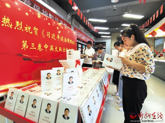 8月7日,在忻州市新華書店,讀者正在翻閱新發(fā)行的《習(xí)近平談治國(guó)理政》第三卷。該書自出版發(fā)行以來(lái),忻州市新華書店第一時(shí)間設(shè)立專架,重點(diǎn)展示銷售。同時(shí),書店還采取多種形式,積極組織力量深入社區(qū)、農(nóng)村、黨政機(jī)關(guān)、企事業(yè)單位、大專院校、部隊(duì)開(kāi)展宣傳征訂工作,保證廣大黨員干部群眾能夠及時(shí)購(gòu)買閱讀到《習(xí)近平談治國(guó)理政》第三卷。 張存良 攝